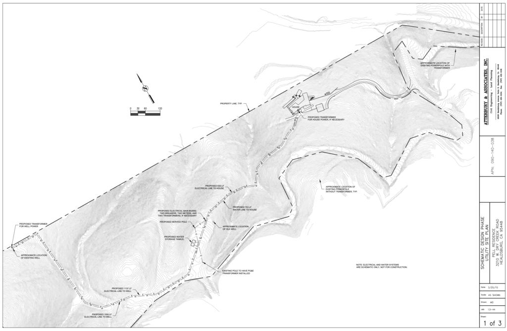 PG&E already has multiple power poles on the edge of the property. Running power to the well and both potential building sites will involve trenching which can be usefully combined with the water distribution system as well as internal trails. Solar is also an option with both the well area and upper building site as excellent candidates for photovoltaic power.